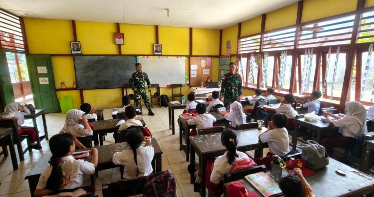 Selain memberikan materi kebangsaan, prajurit juga membagikan perlengkapan sekolah kepada para pelajar sebagai bentuk kepedulian terhadap dunia pendidikan di daerah perbatasan.