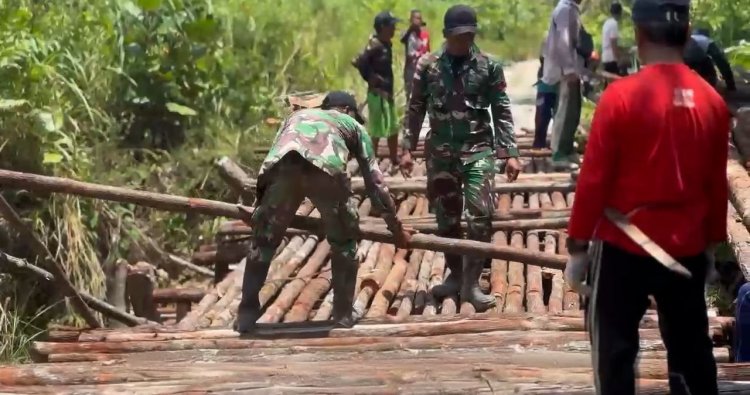 Nanga Badau, Kalimantan Barat - Prajurit Pos Klawik Satgas Pamtas Yonkav 3/AC melaksanakan kegiatan gotong royong bersama masyarakat Desa Klawik dalam memperbaiki jembatan penghubung antar desa.